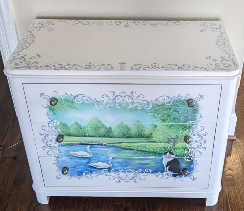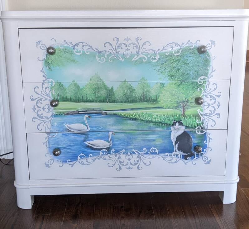 I met Svetlana at an art show and was immediately attracted to her work. She graciously agreed to paint vignettes of the views from our home on a chest of drawers. The result is spectacular!
